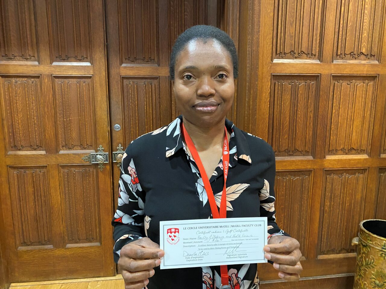 - Endah Ndambi, Administrative Student Affairs Coordinator, Dept. of Diagnostic Radiology – McGill Faculty Club gift certificate/Endah Ndambi, coordonnatrice administrative et des affaires étudiantes, Département de radiologie diagnostique – carte cadeau du Cercle universitaire de McGill