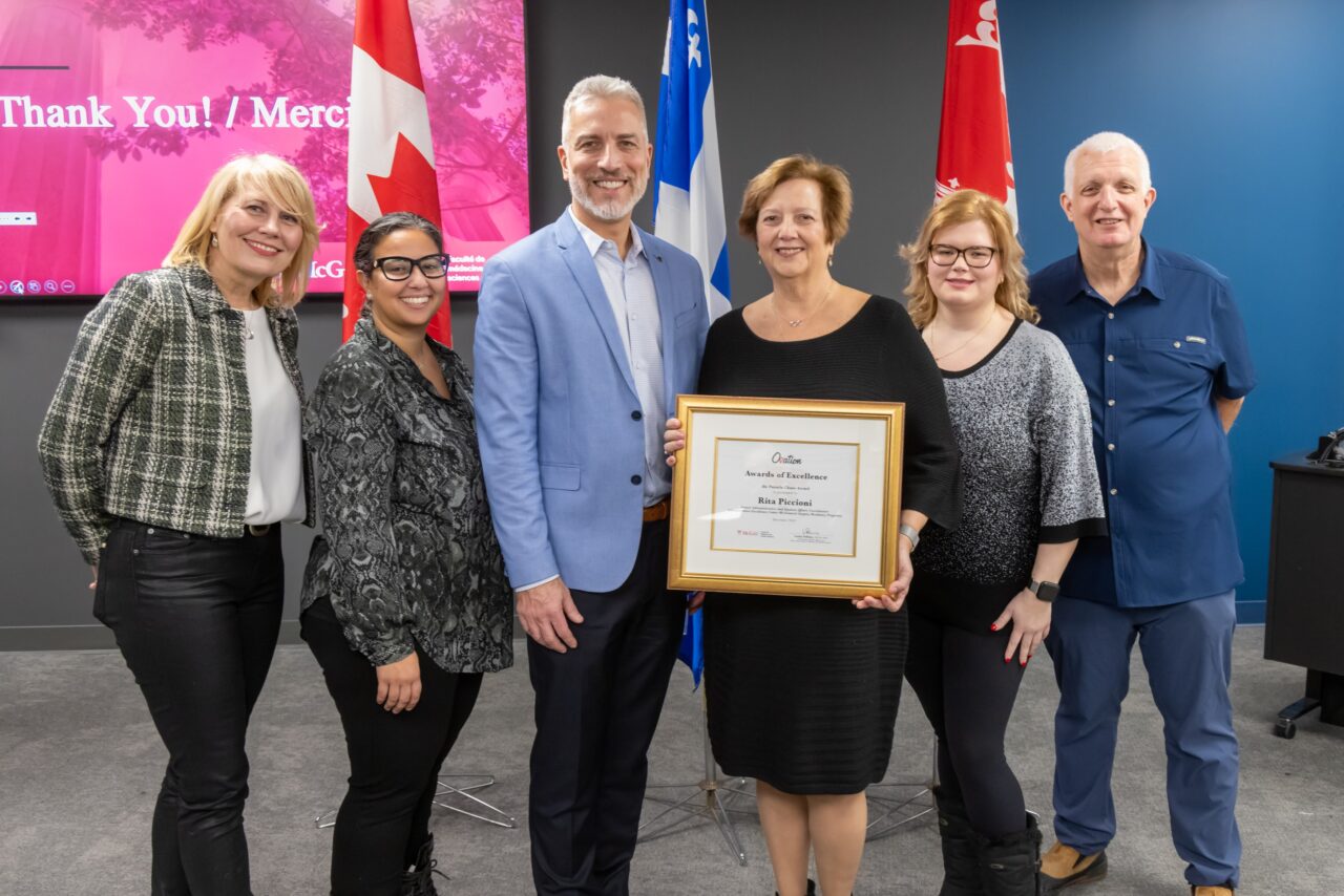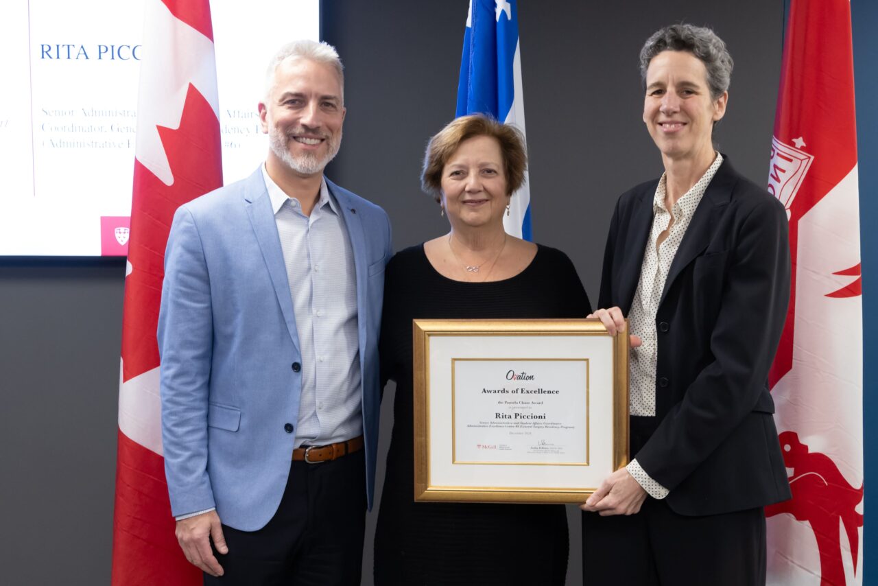 The ceremony began with the presentation of the Pamela Chase Award to Rita Piccioni, Senior Administrative and Student Affairs Coordinator in Administrative Excellence Centre #6. Nominator Sender Liberman, MDCM, Assistant Dean, International Affairs, and Program Director of the General Surgery Residency Program, shared that he had known Rita since his days as a resident.