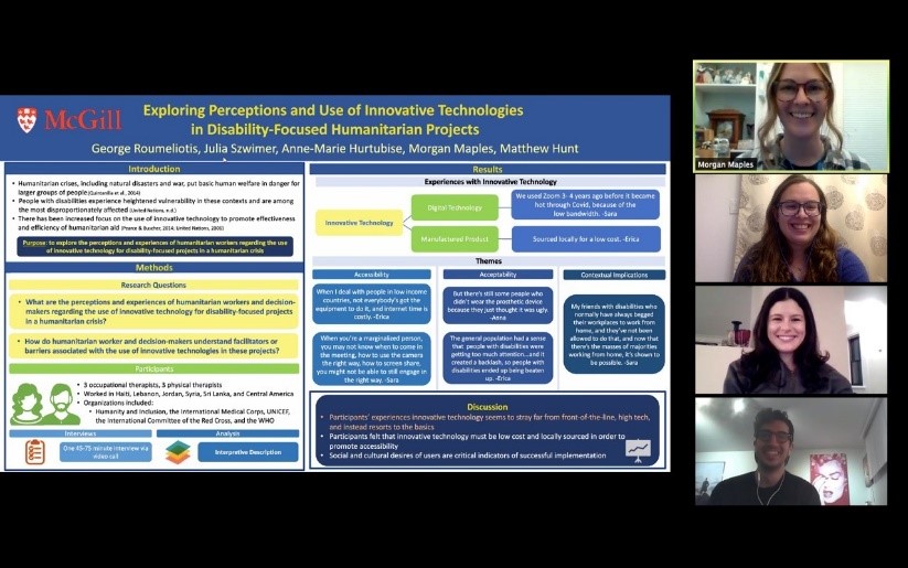 The 2020 Fall semester at the McGill School of Physical and Occupational Therapy was like no other semester. Research programs, clinical education and graduate studies carried on in virtual and modified ways. Some events were postponed but many continued virtually. The two professional programs in Occupational Therapy and Physical Therapy persevered with the critical mission of educating over 700 students at a distance.
